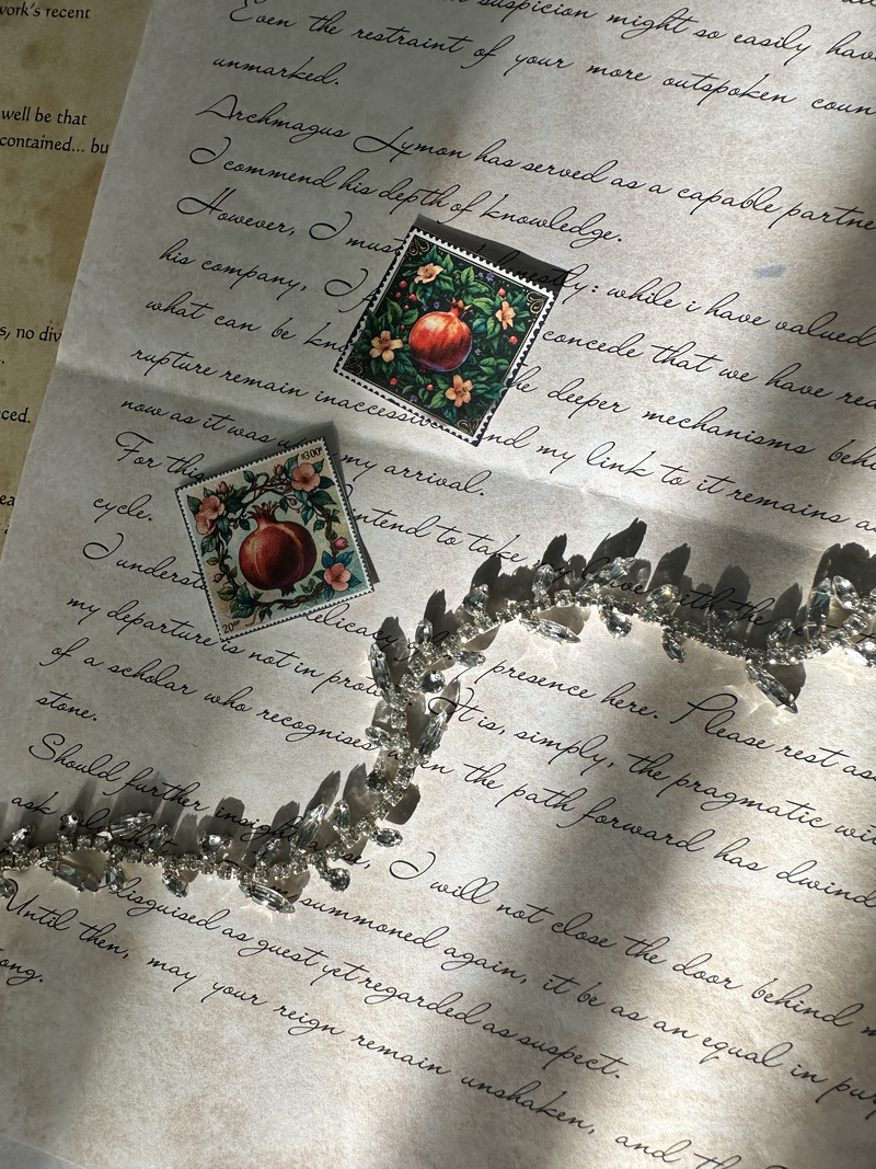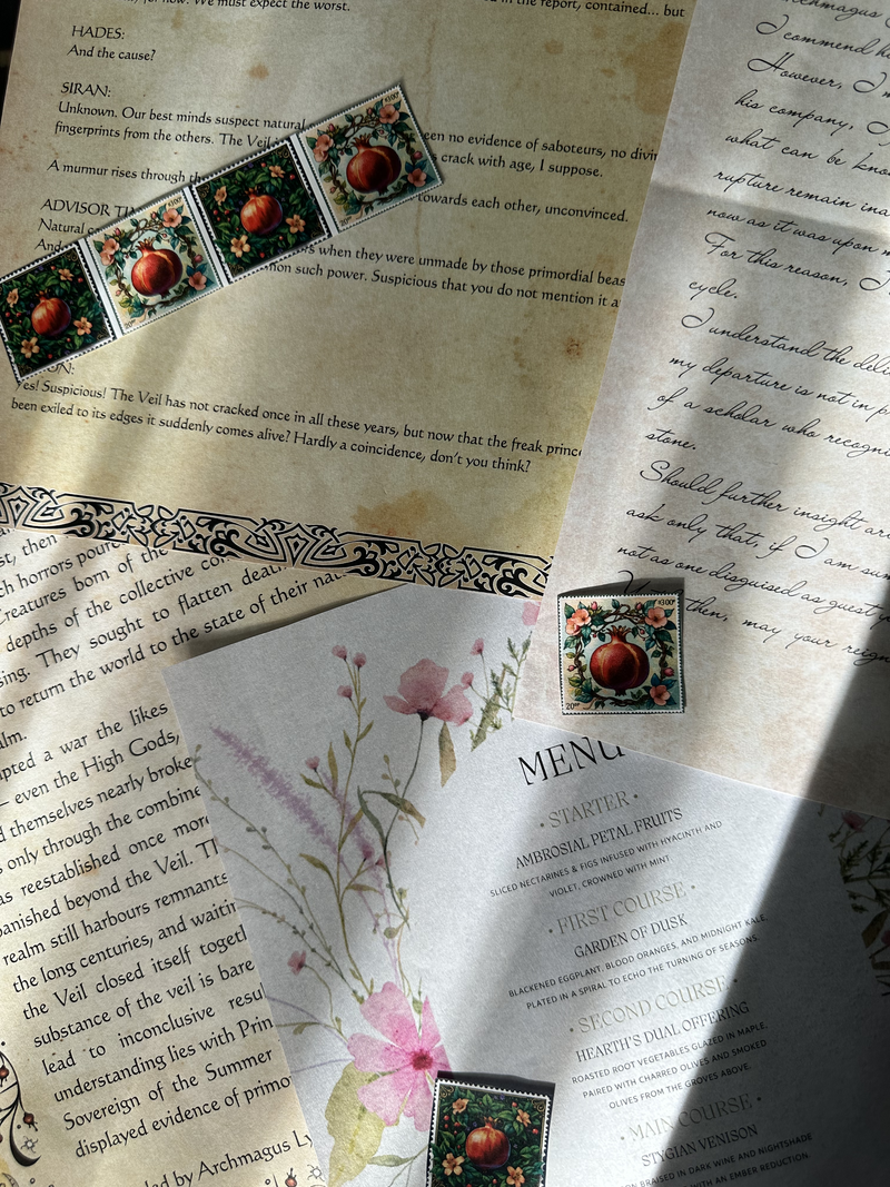Each month, two sealed envelopes arrive at your door: heavy with wax, ink, and secrets. Inside, the voices of Persephone, Hades, and the nobles of the Underworld Court breathe life into a tale of forbidden alliances, whispered betrayals, and love that defies the boundaries of Gods and mortals.